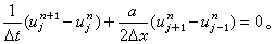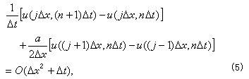 把微分方程(1)的充分光滑的解u(x,t)代入式(6),其误差为 O(Δx2+Δt),叫作差分方程的截断误差, 它对空间x是二阶的,对时间t是一阶的。式(6)就是一个把微分方程(1)离散化而得的差分方程。它联系着点(jΔx, nΔt)及其相邻格点上的u(x,t)的近似值。在计算时,式(6)常写为