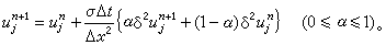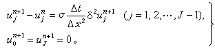 +1(j=1,2,…,J-1)的一组线性联立方程组, 这种格式叫做隐式格式。它的解存在、惟一,并且可用追赶法求解。当r取任何正值时,它都是稳定的,其截断误差也是O(Δx2+Δt),由于r无限制,Δt比显式格式可相对取得大一些,当然Δt太大了,也要影响到截断误差。