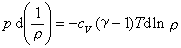 式中 dQ、dU 分别为加于单位质量的热量、内能的变化。曾经把满足方程p=ρrT的气体叫做理想气体,自20世纪中期以来在流体力学中则把它改称为完全气体。对于常比热容完全气体模型,还把定容比热容сv、定压比热容Cp都看作是常数,且r=сv(γ-1),式中γ=сp/сv称为比热容比又称绝热指数。当无粘常比热容完全气体的密度变化时,压力所做的功为