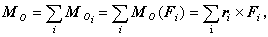 称为力系对点O的主矩。力系的主矢量R和力系对于点O的主矩MO是力系的两个基本物理量。由F和MO所构成的力系 {R,MO}同原力系{F1,F)2,…,