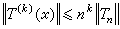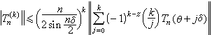 这是1912年С.Η.伯恩斯坦发现的,称为伯恩斯坦不等式。其中系数n不能再减小,例如对任何常数A及α,Tn(x)=A sin(nx+α)都使它成等式。伯恩斯坦不等式在函数逼近论中起着重要的作用,并且有着各种拓广。例如,С.Б.斯捷奇金于1948年证明,对任何n阶三角多项式Tn(x)及自然数k,都有
