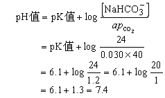由于血液中啹CO3的含量极少,不易直接测量,但啹CO3的含量取决于CO2的溶解度(α)和CO2的分压(pco2),因此,可将上式写成下式。血浆NaHCO3浓度为24毫克当量/升。正常动脉血浆pco2为40毫米汞柱,α为0.030。