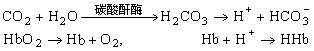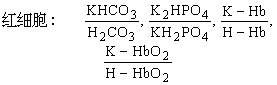 在红细胞中,量重要的缓冲剂是 K-HbO2/H-HbO2及K-Hb/H-Hb。当血液流过组织时,组织所产生的CO2通过血浆而进入红细胞,在细胞内借助于碳酸酐酶的作用,迅速形成啹CO3,后者解离为H+和HCO婣。HCO3可以顺着浓度差而弥散于血浆,这时引起血浆中的Cl-弥散入红细胞内(称为Cl-转移),从而维持红细胞内外的电中性。组织内的氧分压很低,于是红细胞中的HbO2释放出O2以供给组织的氧化代谢。由于Hb的酸性较HbO2要弱,Hb便与H+结合而成HHb,红细胞内的pH值得以保持恒定。以上反应如下式的上一箭头的方向所示: