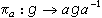 对G中任意g定义G到G上的一个一一对应,且为G的一个自同构,称为内自同构。一个正规子群就是一个在所有内自同构下不变的子群,因此又称为不变子群。g在映射πα下的像αgα-1称为g的一个共轭元素,也可以说αgα-1与g共轭。元素的共轭也是一个等价关系,因此,G的全体元素可分割为一些没有公共元素的共轭(元素)类。