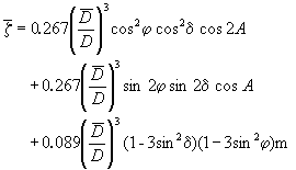 为了说明潮汐的周期和振幅的变化,在前面公式中引入月球天顶距θ与月球赤纬δ、当地纬度φ和月球时角A 的关系,则前面的太阴平衡潮公式可化为