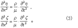 式中ρ是介质的密度,λ 、μ是拉梅常数,t 是时间。3个方程都具有波动方程的形式。方程(2)表示纵波,因为ξ与传播方向x一致;方程(3)表示横波,因为η和ζ都与x垂直。由(2)可见,纵波的传播速度vP是