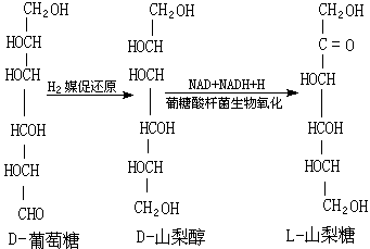 在用维生素C一步和二步发酵法生产中,起主要氧化作用的葡糖酸杆菌对作用底物(D-山梨醇或L-山梨糖)的分子结构进行特异性改变,是典型的微生物转化: