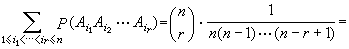 用Ai表示事件“第 i号信纸恰装入第 i号信封”,则 P(Ai)=1/n。在 Ai发生的条件下,第 j 号信纸共有n-1个信封可供选择, 故 P(Aj|Ai)=1/(n-1),因此 P(Ai Aj)= 1/n(n-1), 其中 i≠j。类似地, 对1≤i1<i2<…ir≤n,