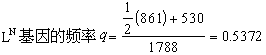 把上述结果概括起来:在一个大群体里如果交配随机,没有突变,没有迁移,也没有自然选择的影响,那么群体中三种基因型的频率就可以一代代保持不变。例如人的MN血型是由一对共显性基因 LM和LN决定,M型和N型个体都是纯合体,MM型是杂合体。在上海居民中调查了1788人,其中397人是M型,861人是MN型,530人是N型。因此