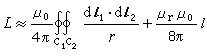 式中C1是细导体的轴线,dl1是轴线的长度元;C2是沿着回路依附于细导体表面上内侧的闭合曲线,dl2为该曲线的长度元。式(6)中的双重线积分项代表导体外部的磁通与整匝导线相链的部分电感,叫做外自感;式中后一项代表圆柱形导体内部的磁通产生的部分电感,叫做内自感。内自感正比于导线的长度 l和导线材料的磁导率μrμo,而与导线的半径无关。