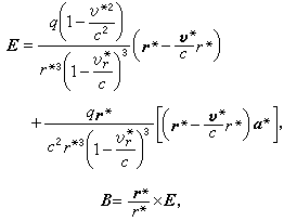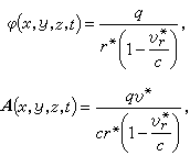 ´Ë½á¹û³ÆÎªÀîÄÉ-άл¶ûÊÆ¡£Ê½ÖÐq´ú±íÁ£×ӵĵçºÉ£¬§ã´ú±íÕæ¿ÕÖеĹâËÙ£¬r´ú±í´ÓÁ£×Óµ½ËùÌÖÂ۵ij¡µã(x£¬y£¬z)µÄ¾àÀ룬v´ú±íÁ£×ÓµÄËÙ¶È£¬¦Ôr´ú±ívÔÚr·½ÏòµÄ·ÖÁ¿¡£¼Ó*ºÅ±íʾÕâЩֵ²»ÊÇÈ¡tʱ¿ÌµÄÖµ¶øÊÇȡijһ½ÏÔçʱ¿Ìt*ʱµÄÖµ£¬ÕâÊÇÒòΪµç´ÅÓ°ÏìÒÔÓÐÏÞËٶȧ㴫²¥µÄÔµ¹Ê¡£Ê½ÖеÄ