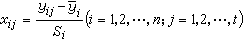 xij表示变换后的新数据,相应的原来数据是yij。原始数值矩阵Y经标准化变换后,得新的数值矩阵: