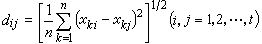 其中xki 和xkj 取自矩阵X的第 k行,分别为第i和第j列元素;dij表示第i与第j分类单位之间的距离系数。
