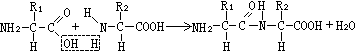 这是一个缩合反应,脱去一分子水。关键在于需要有措施使第1个氨基酸的氨基与第2个氨基酸的羧基不参与反应。方法是将这些不希望参加反应的基团用一些特殊的化学试剂与之反应,使生成的基团对缩合反应不敏感,还能在肽合成后,在不破坏肽键及氨基酸结构的条件下将它们恢复成原先的基团。这一类试剂称保护试剂,形成的基团称保护基。两个小肽缩合成较大的肽的原则也同此。因此肽的化学合成可归结为两个问题,一是不希望参与肽键缩合反应的基团的保护,二是用缩合剂引起缩合反应。