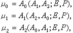 式中A0(A1,A2;E,p)表示四条直线A0A1,A0A2,A0E,A0p 的交比,其余两式相仿。不难证明,μ0μ1μ2=1。于是可以令
