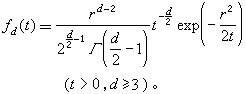 ,这里Χα(t)=α+Χ(t)表示自α出发的布朗运动。因而自某一时刻以后,粒子不再回到α的附近,而且d(≥3)越大,粒子趋于无穷的速度也越快。设Br是以O为中心,以r为半径的球,定义粒子最后一次离开Br的时刻为λr=sup{t>0:Χ(t)∈Br},λr称为Br的“末离时”。从O出发的布朗运动Χ首达Br的点与末离Br的点在球面上都有相同的均匀分布,而且λr的概率分布密度函数为