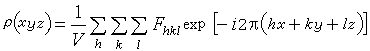 数值的傅立叶综合。式中V指晶胞体积,hkl称为衍射指标,表示衍射方向或反射的位置。ρ(xyz)是电子密度函数,表示晶胞中坐标为(xyz)点上电子密度的数值。电子密度峰的位置即为原子的中心位置。