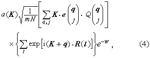 r(L是阵点l的平衡位置,u(L是它对平衡位置的偏离,k=k-k┡称为散射矢量,a(k)是原子的散射因子。把式(1)对u(L展开,它的零次项给出通常的布喇格散射,只有散射矢量k 等于倒易点阵点阵矢时才不为零。但展开的二级、四级、六级、……等偶次项中也有相类似的项。如果把这些项都归结在一起,并把u(L用点阵波的叠加来表示,就会得到散射振幅正比于:
