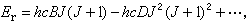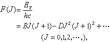 式中的h为普朗克常数;с为真空中光速。上式右边第一项是假定分子为刚性转子时的转动光谱项;第二项是考虑实际分子为非刚性时由于转动离心形变效应引起的小修正项;其后的各项则是更小的修正项。式中J为分子的转动量子数,与它对应的转动角动量为