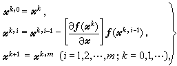 若在牛顿法(2)中解线性方程组不用直接法,而采用迭代法则得到一类解非线性方程组的双重迭代法。按解线性方程组采用的方法不同就得到不同名称的迭代法,如牛顿-赛德尔迭代法,牛顿-SOR迭代法,牛顿-ADI迭代法,等等。这些方法都具有超线性收敛速度,工作量也比牛顿法大,除了对某些特殊稀疏方程组外,通常用得校少。若将解线性方程组迭代法的思想直接用于非线性方程组(1),然后把(1)化为一维方程求解,可得到另一类双重迭代法,由于采用的迭代法与解一维非线性方程的方法不同,则得到不同的双重迭代法。如果利用SOR迭代法后再用牛顿法解一维方程则得SOR-牛顿迭代法,在牛顿法中只计算一步而不进行迭代,则得一步的SOR-牛顿迭代,其计算公式可表示为