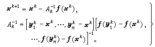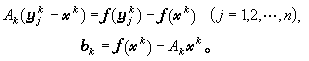 中的Ak和bk,则可得到一类称为割线法的迭代序列。假定已知第k步近似尣k,为确定Ak和bk,可在尣k附近取n个辅助点у忋(j=1,2,…,n),使n个向量