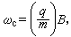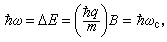 称为回旋角频率。如果在垂直B的平面内加上高频电场E(ω)(ω为电场的角频率),并且ω=ωc,则这带电粒子将周期性地受到电场 E(ω)的加速作用。因为这与回旋加速器的作用相似,故称回旋共振。又因为不加高频电场时,这与抗磁性相类似,故亦称抗磁共振。当v垂直于B时,描述这种共振运动的方程是d(mv)/dt=q(vB),若用量子力学图像描述,可以把回旋共振看作是高频电场引起带电粒子运动状态在磁场中产生的朗道能级间的跃迁,满足共振跃迁的条件是: