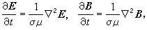 非定频的扩散方程(1)在实际中亦有应用。如磁场的扩散在许多领域中都是一个重要效应。η=1/σ μ称为扩散率,σ μ 愈大,扩散就愈慢。由于这种扩散效应,导体中若原有磁场,则该磁场将随时间而衰减。对于实验室中的导体,扩散时间τ一般较小,铜是电导率很大的导体,可是对1厘米半径的铜球,τ也只有10-2秒。但若导体大小达到天体的线度时,则τ可以达到很大的值。例如太阳中的磁场,τ可达1010年。