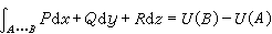 只要这些偏导数都是连续的。反之,当这些偏导数都是连续的并且满足这些恒等式时,在V的每一个(曲面)单连通的有界部分区域V1(意即在其内的每一条光滑的简单闭曲线都有一块以它为全部边界的光滑闭曲面)内都存在一个函数U,它的全微分 dU恰好就是原来的微分式Pdx+Qdy+Rdz。于是,在V1内,对于每一条逐段光滑的曲线 A …B 都有