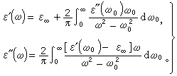 上面两式称为克喇末-克朗尼格色散关系。式中ε→∞为频率远高于共振频率或红外频率时的介电常数,ωo为特征振动频率。式中的ε″(ω)=ε′(ω)tgδ代表介质的能量损失,tgδ称为损耗角正切或介电损耗因子。