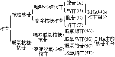 组成RNA的核苷酸是核糖核苷酸,构成DNA的是脱氧核糖核苷酸,两者分别由碱基-核糖-磷酸和碱基-脱氧核糖-磷酸依次连接而成。