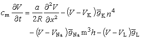 其中V表示神经纤维膜电位,R是轴向电阻率,α是轴突半径,x表示神经纤维轴向距离。等式左边代表膜电容产生的电流分量;右边第一项代表神经纤维横截面电流变化率;右边其余三项分别代表钾、钠和其他离子产生的电流分量。霍奇金曾以枪乌贼神经纤维为实验材料,根据H-H方程计算得到的曲线与实验结果吻合得很好(见生物膜离子通道)。