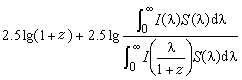 其中第一项是由于红移后波段展宽而加上的改正;第二项是由于红移后波段频移而加上的改正。I(λ)是波长λ处的入射能流,是在相对于天体静止的坐标系内,并作了望远镜接收系统改正和大气消光改正的。