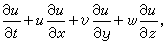式中第一项是在空间坐标系中固定的某一点(例如,可记作x0,y0,z0),在t和t+Δt两时刻的两个不同物质质点的x方向分速度u(x0,y0,z0,t)和u(x0,y0,z0,t+Δt), 把后者减去前者再除以 Δt再取极限即可形成