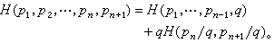 表示,其中1,2,…,n为可能发生的结果,pi为i发生的概率。x的不肯定性大小取决于n的大小与pi分布的均匀程度。这个不肯定性是(p1,p2,…,pn)的一个函数,记为H,它具有性质:(1)对称连续性,即H(p1,p2,…,pn)是p1,p2,…,pn的对称连续函数;(2)H(0,1)=0;(3)如q=pn+pn+1则