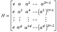 为一个dr×2r-1阶矩阵,这里把α看作一个2元r维列向量。如U0的校验矩阵是(30)的H,则称U0是BCH码。它是一个2元(2r-1,2r-1-dr)码,d称为设计距离,其纠错能力为