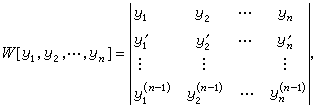 后一行列式称为y1,y2,…,yn的朗斯基行列式。由它在(α,b)中任一点的值等于零或不等于零,可判定 y1,y2,…yn在(α,b)中是(8)的线性相关解或线性独立解。由此,方程(8)必存在n个线性独立解,而任何n+1个解都是线性相关的。