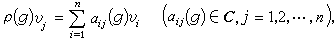 设ρ:G→GL(V)是有限群G的一个表示。如果选V的一个基υ1,υ2…,υn,并令