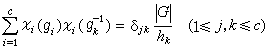 ,则ⅹρ是定义在G上的函数。显然它在G的共轭类上取相同的值,因此ⅹρ是G的类函数,ⅹρ称为表示ρ的特征标。当ρ不可约时,ⅹρ称为不可约特征标。特征标实际上确定了表示,可以证明,两个表示等价,当且仅当它们的特征标相等。利用特征标还可以证明,G只有有限个不同的不可约特征标,其个数恰好等于G的共轭类的个数。因此研究有限群的不可约特征标是有重要意义的。关于不可约特征标有所谓正交关系,即设ⅹ1,ⅹ2,…,ⅹc是G的不同的不可约特征标,g1,g2,…,gc是G的所有的不同的共轭类中的代表元,而h1,h2,…,hc是这些共轭类中元素个数,则有