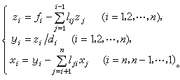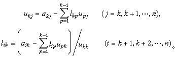Èý½Ç·Ö½â·¨ÓÖ³ÆÒò×ӷֽⷨ£¬ÊÇÓÉÏûÔª·¨ÑÝ±ä¶øÀ´µÄ½âÏßÐÔ´úÊý·½³Ì×éµÄÒ»ÖÖ·½·¨£¬Ëü½«·½³Ì×é(4)ÖеÄϵÊý¾ØÕóA·Ö½â³ÉÏÂÈý½ÇÐξØÕóLºÍÉÏÈý½ÇÐξØÕó UÖ®»ý¡£ËüÓм¸ÖÖÐÎʽ£¬ÀýÈç¿ÉÈ¡LµÄ¶Ô½ÇÏßÔªËØÎª1£¬¼´LΪµ¥Î»ÏÂÈý½ÇÐξØÕó¡£ÕâÖÖÇéÐÎϽ«LºÍUÏà³Ë£¬²¢ÓëA±È½Ï£¬¿ÉÖªLºÍUµÄÔªËØlijºÍuij¿ÉÓÉÏÂÁеÝÍÆ¹«Ê½¸ø³ö£º¶Ôk=1£¬2£¬¡£¬n£¬