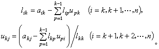 ¼ÆËãʱ£¬ÏÈËãLµÄµÚÒ»ÁУ¬ÔÙËãUµÄµÚÒ»Ðеȵȣ¬Í¬Ñù¿ÉÔÚËãÍêlkk£¬lk+1£¬k£¬¡£¬lnkºóÑ¡Ö÷Ôª£¬½øÐÐÐеĽ»»»£¬µ«Í¬Ê±Òª½«ƒ µÄ·ÖÁ¿½øÐÐÏàÓ¦µÄ½»»»¡£ÆäÇó½âµÄ¹ý³ÌÒ²ºÍ(5)¡¢(6)ÀàËÆ¡£
