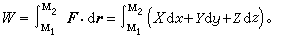 设力F在直角坐标系Oxyz(见图)的各坐标轴上的投影分别为X、Y、Z,而质点的元位移dr的投影分别为dx、dy、dz,则力F在质点M处由位置M1到M2的有限位移中所做的功W为