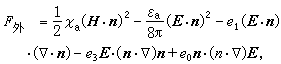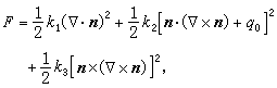 为螺距。q0=0时成为向列相的表达式。上式称为奥钦(1933)-夫兰克(1958)自由能密度。k1、k2和k3分别为展曲、扭曲和弯曲曲率弹性常数。在外电场E(r)和外磁场H(r)作用下,还有附加自由能密度F