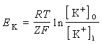 伯恩斯坦的膜学说1902年J.伯恩斯坦最先用膜学说解释生物电的产生。当时人们只粗略地知道,细胞内液比细胞外液含较多的K+,并且根据细胞损伤处电位较完好处为低的事实,推测静息时细胞内电位低于细胞外。由此他假定静息时细胞膜只对K+有通透性,由于细胞内K+浓度高而向细胞外扩散,使膜的内、外两侧出现电位差,即细胞内较负,细胞外较正。当K+外流造成的电位差或电场力达到某一数值时,细胞内外的浓度差所造成的K+净外流便停止,于是膜两侧电位差将不再增加而达到平衡。这时可根据W.H.能斯脱推导的公式算出: