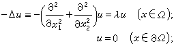 是一个典型的偏微分算子的特征值问题,这里x=(x1,x2);Ω是膜所占据的平面区域。使得问题有非平凡解(非零解)的参数λ的值,称为特征值;相应的解称为特征函数。当Ω有界且边界嬠Ω满足一定的正则条件时,存在可数无穷个特征值