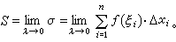 令λ表示分划的最大的子区间的长度。如果当λ→0时,和式σ趋于某一个确定的极限I,则称这极限I为函数ƒ(x)在区间[α,b]上的定积分或黎曼积分,记为