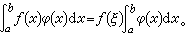第一中值定理 对于区间[α,b]上一个连续函数ƒ(x)与一个不变号的可积函数φ(x),一定存在该区间上一点ξ,使得