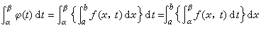假设ƒ(x,t)是一个定义在平面矩形区域R(α≤x≤b;α≤t≤β)上的二元连续函数,考虑它对x在区间[α,b]上的积分,在积分过程中被积函数所依赖的变量t始终保持某一个固定的值。这个积分称为含参变量 t的积分。由于积分值依赖于t而惟一确定,由此可以定义t的一个函数