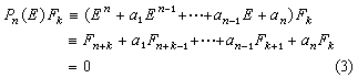 给定 (F0,F1,…,Fn-1)的定值例如(0, 0,…,1)即可依次从(3)算出Fn,Fn+1,…。这样就定出差分方程的一个特解。