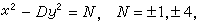 对于不定方程(8),很明显,在N=-1时,如果D含有4k+3形状的素因数,就无整数解。但是如果它有一组整数解,就有无穷多组解。可类似(9)那样定义它的最小解。如果它有最小解 x=α,y =b,那么它的全部解由