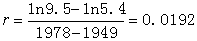 1949年以来,中国人口自然增长率为0.0192或19.2‰,即平均每年每1000人增加19.2人。转成周限增长率,λ=er=e0.0192=1.0193,即每年为前一年的1.02倍。